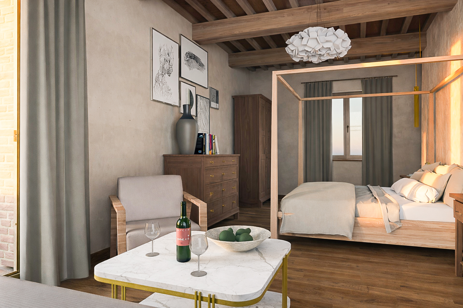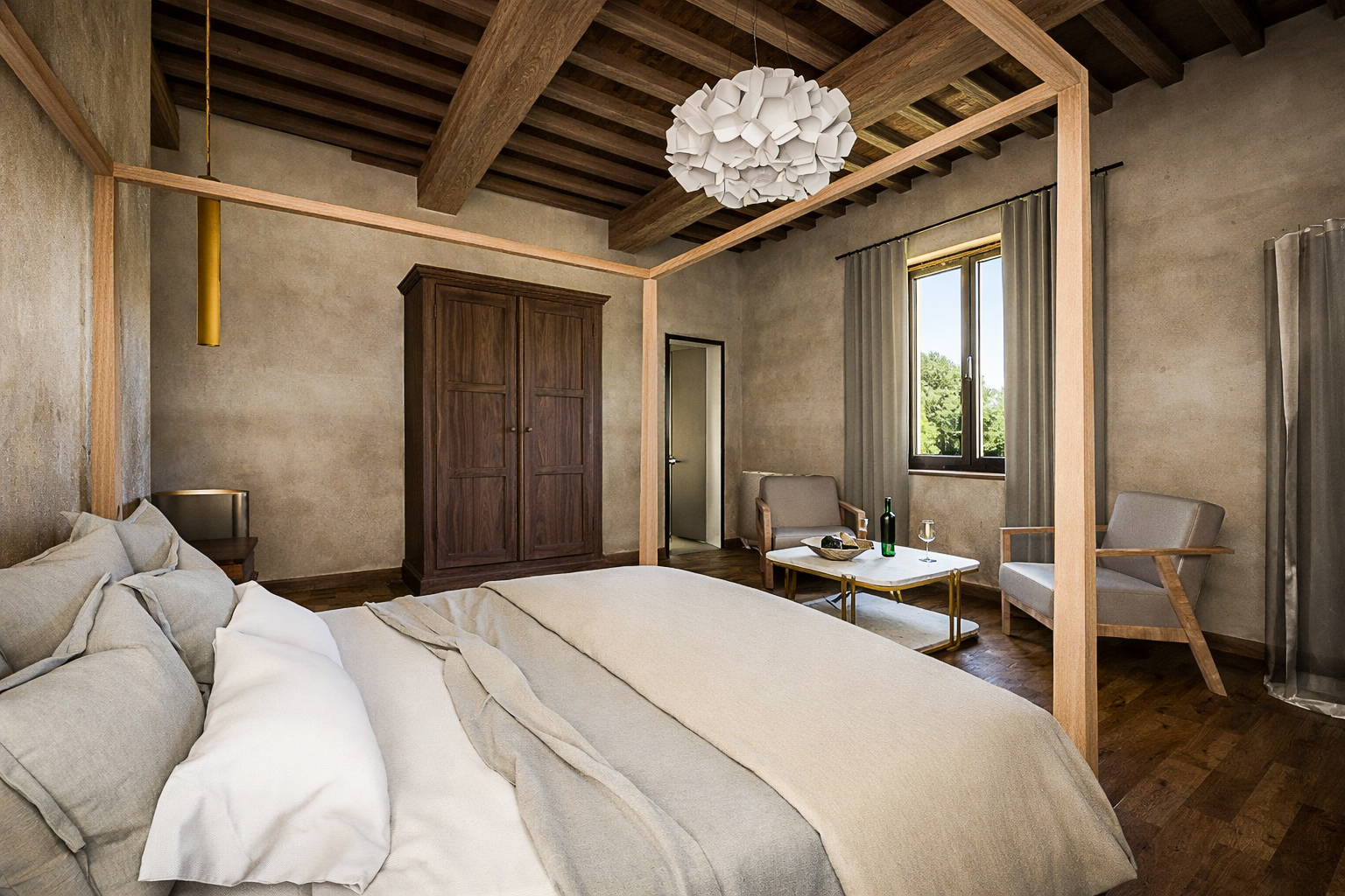 Dotata di un letto a baldacchino realizzato a mano e incorniciata da travi in legno a vista, la suite fonde materiali toscani contemporanei con un'eleganza sobria.